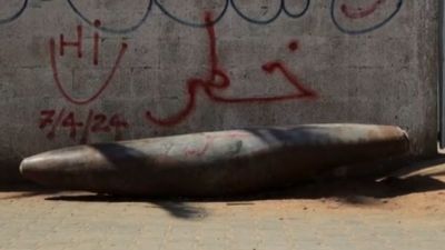 مقطع فيديو بثته الأمم المتحدة يظهر صاروخاً إسرائيلياً غير منفجر في دير البلح، وهي منطقة مكتظة بالسكان وسط قطاع غزة.