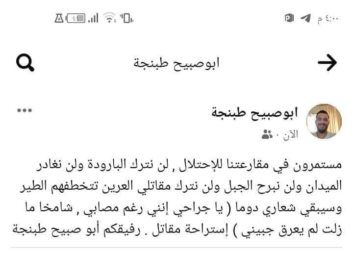 وقال طبنجة في تغريدته على مواقع التواصل الاجتماعي التي اعلن فيها عن خطوته :" مستمرون في مقارعتنا للاحتلال، لن نترك البارودة ولن نغادر الميدان ولن نبرح الجبل ولن نترك مقاتلي العرين تتخطفهم الطير وسيبقي شعاري دوما (يا جراحي إنني رغم مصابي, شامخا ما زلت لم يعرق جبيني) استراحة مقاتل".