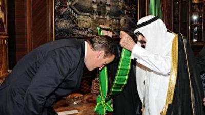 الملك عبد الله بن عبد العزيز يقلد رئيس الوزراء البريطاني ديفيد كاميرون وشاح الملك عبد العزيز