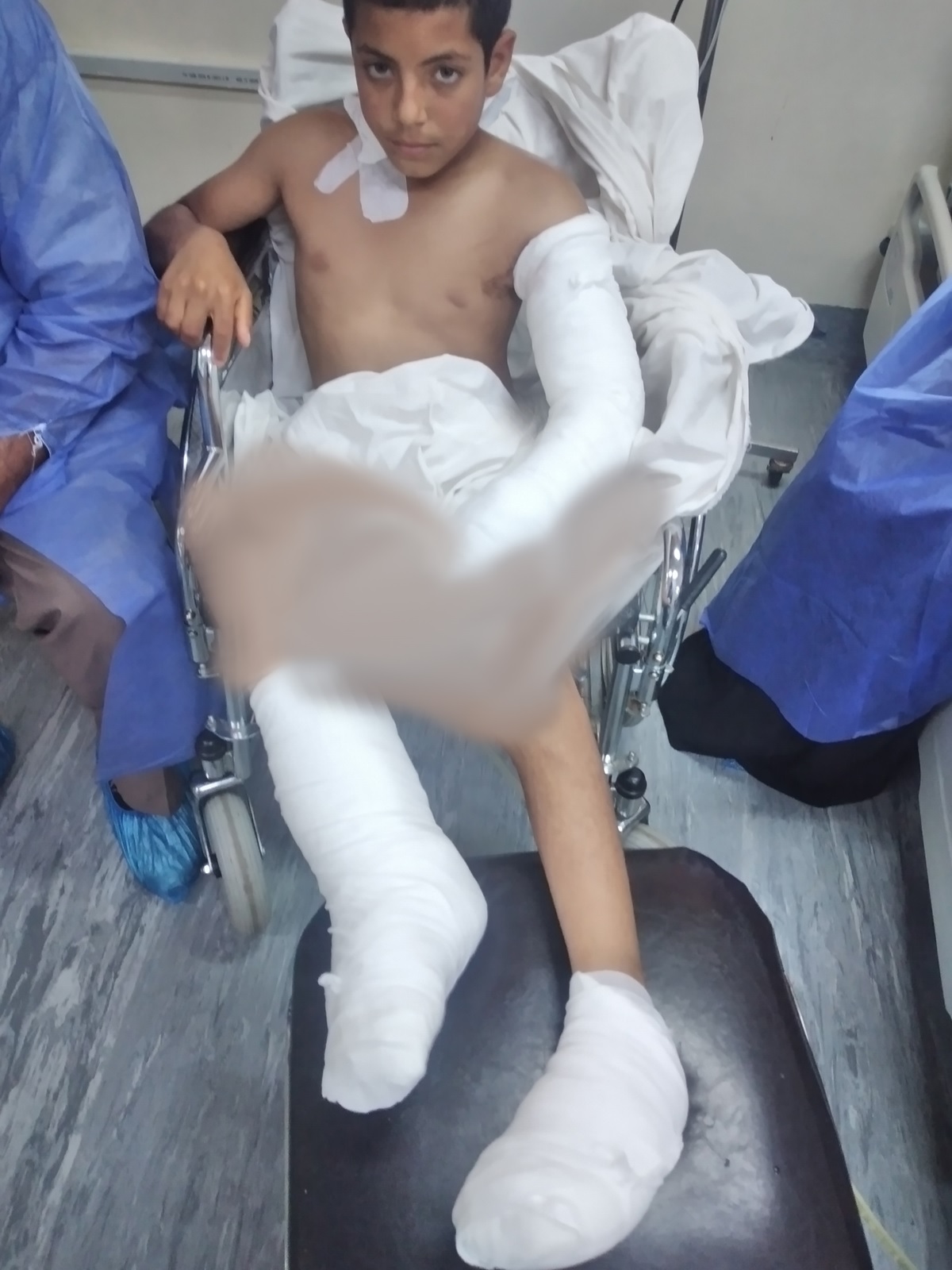 موضحا تعرض لإصابات خطيرة في يده اليسرى قد تستدعي بترها، كما أصيب بجروح خطيرة في أماكن أخرى من جسده.