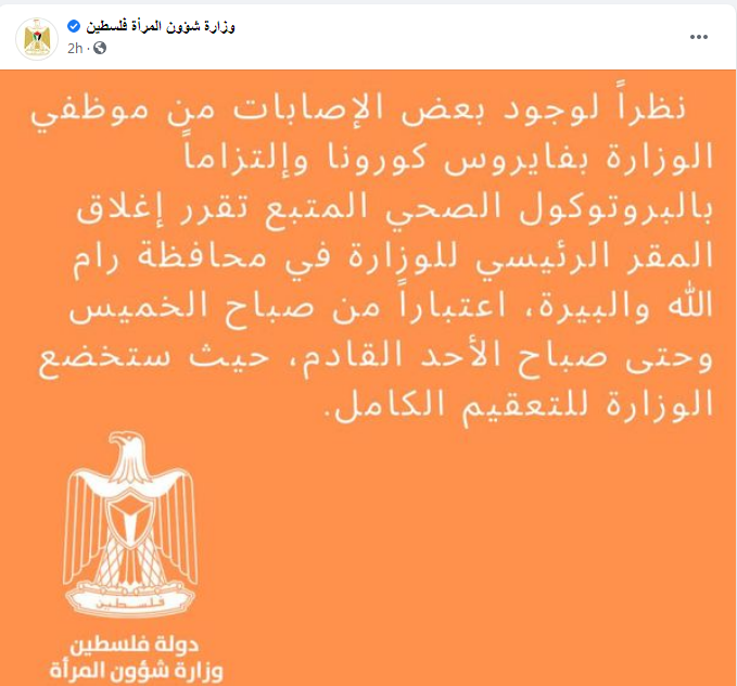 كما قررت وزارة شؤون المرأة، إغلاق المقر الرئيسي للوزارة في محافظة رام الله والبيرة، اعتبارا من صباح الخميس وحتى صباح الأحد، حيث ستخضع الوزارة للتعقيم الكامل نظرا لوجود بعض الإصابات من موظفي الوزارة بفيروس كورونا.