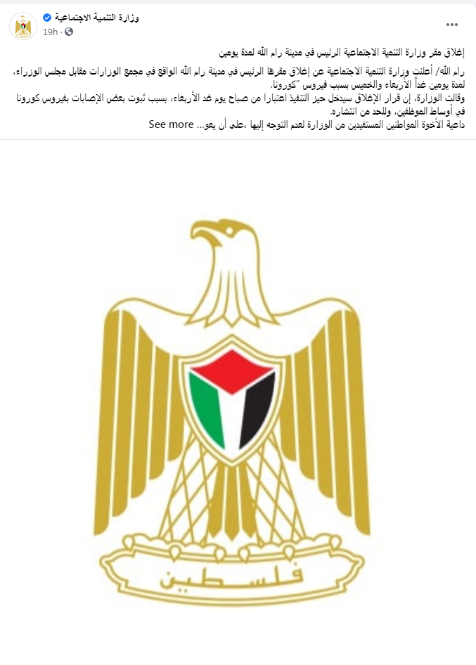 كما أعلنت وزارة التنمية الاجتماعية عن إغلاق مقرها الرئيسي في مدينة رام الله الواقع في مجمع الوزارات مقابل مجلس الوزراء لمدة يومين، الأربعاء والخميس بسبب فيروس كورونا.