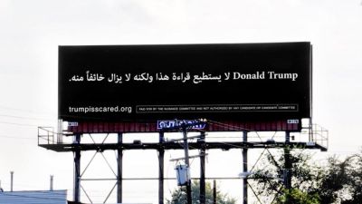 وتندد اللوحة بخطاب هذا المرشح الجمهوري للرئاسيات الأمريكية الذي ينظر إلى المسلمين نظرة سيئة. الفكرة من اللوحة الإعلانية المكتوبة بالعربية هي تخويف هذا المرشح الملياردير.