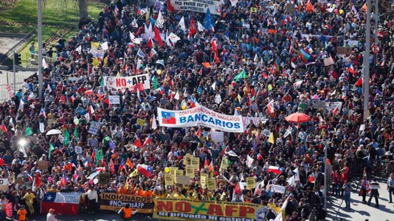 خرج مئات الآلاف من الأشخاص الى شوارع العاصمة سانتياغو دي تشيلي علاوة على مدن اخرى يوم الاحد احتجاجا على نظام التقاعد الخاص في تشيلي.