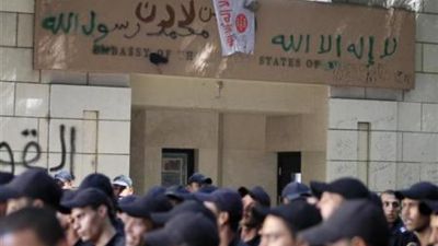 وقالت ان الاشخاص الاربعة أحيلوا إلى النيابة وان قوات الامن ما زالت تبحث عن آخرين تسلقوا اسوار السفارة. ومزق بعض من دخلوا مجمع السفارة بطريقة غير مشروعة العلم الامريكي.