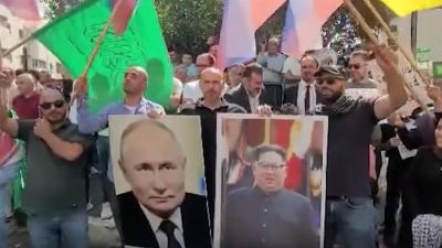 وقال منظمون للتظاهرة ان رفع صورتي الزعيمين بوتين وجونغ اون واعلام بلديهما ياتي تعبيرا عن الشكر على موقف بلديهما المساند للفلسطينيين والمندد بالعدوان الذي تشنه اسرائيل على قطاع غزة لليوم الرابع عشر على التوالي.