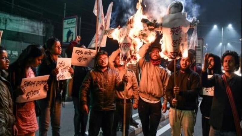 نشطاء من اتحاد الطلاب الهنود يحرقون دمى لرئيس وزراء ولاية اسام في غواهاتي