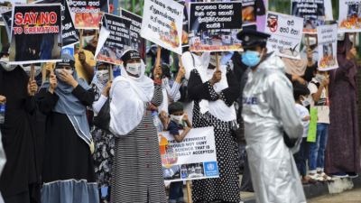 وحمل المتظاهرون لافتة كتب عليها “احترموا بيان رئيس الوزراء واسمحوا بالدفن”، وذلك خلال تجمّعهم أمام مكتب الرئيس غوتابايا راجاباكسا .