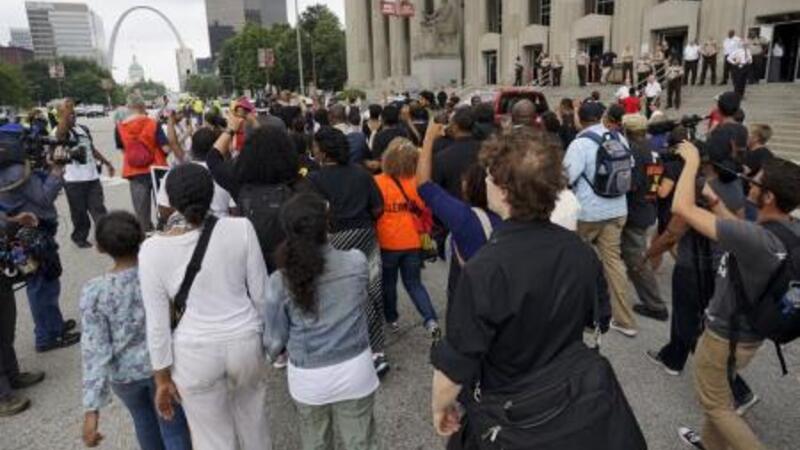 محتجون يسيرون في مقاطعة سانت لويس يوم الاثنين بمناسبة ذكرى مرور عام على مقتل شاب أسود.
