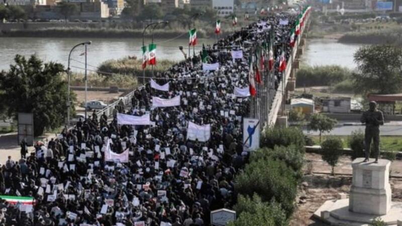 وأظهرت تسجيلات مصورة للمظاهرات في عدة مدن المشاركين وهم يهتفون ”ندعم الإمام خامنئي... لن نتركه وحيدا في حربه على الأعداء“.