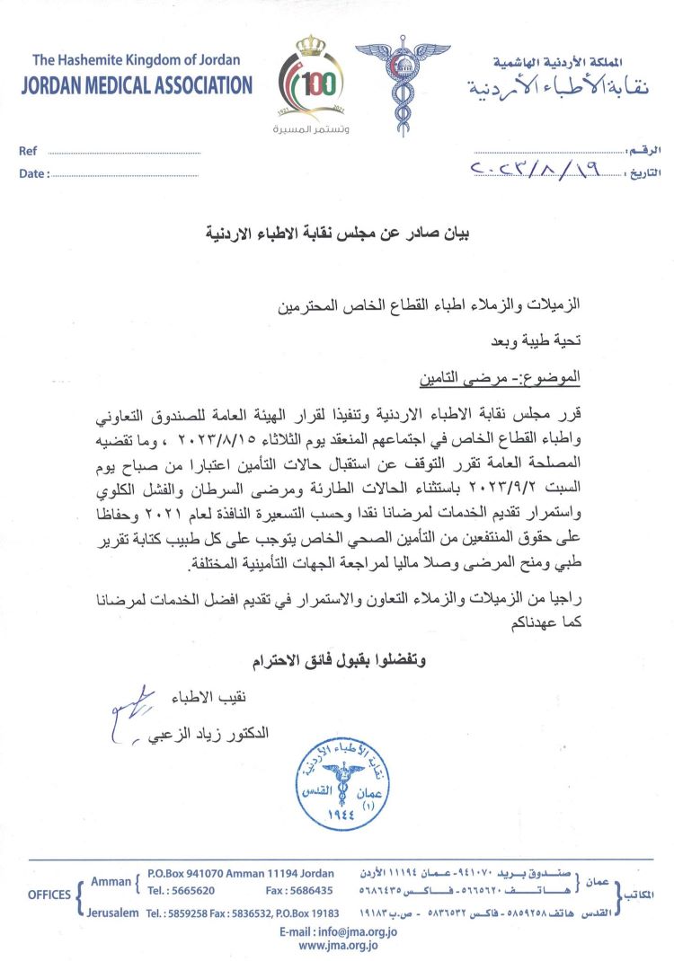 قرار نقابة الاطباء الاردنية الخاص بوقف التعامل مع شركات التامين