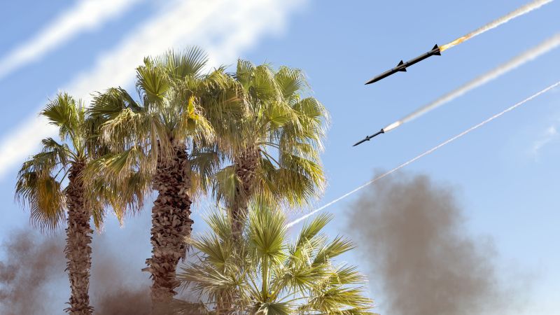 صواريخ باليستية في السماء على خلفية أشجار النخيل، مع آثار إطلاق الصواريخ…