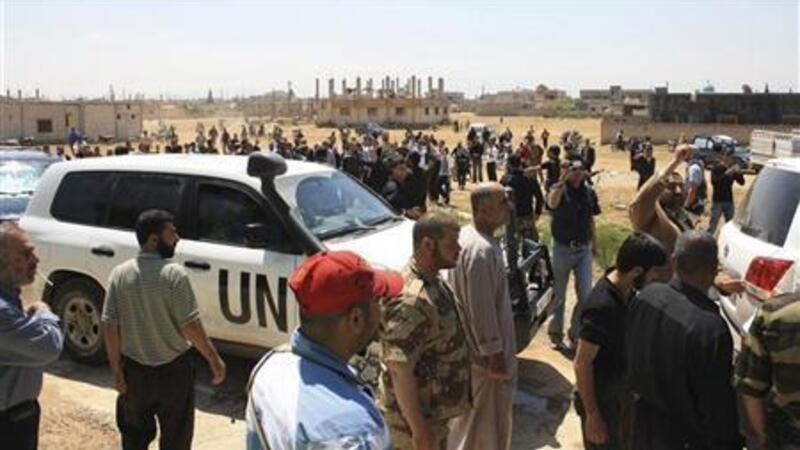 في غضون ذلك انفجرت قنبلة اليوم في درعا قرب موكب مراقبي الامم المتحدة بقيادة الميجر جنرال روبرت مود المكلف بتنفيذ اتفاق وقف اطلاق النار الذي توصل عليه عنان ودخل حيز التنفيذ في 12 ابريل.