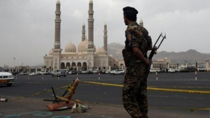 جندي يمني يقف حارسا خارج مسجد الصالح خلال مراسم تشييع ضحايا احد التفجيرات