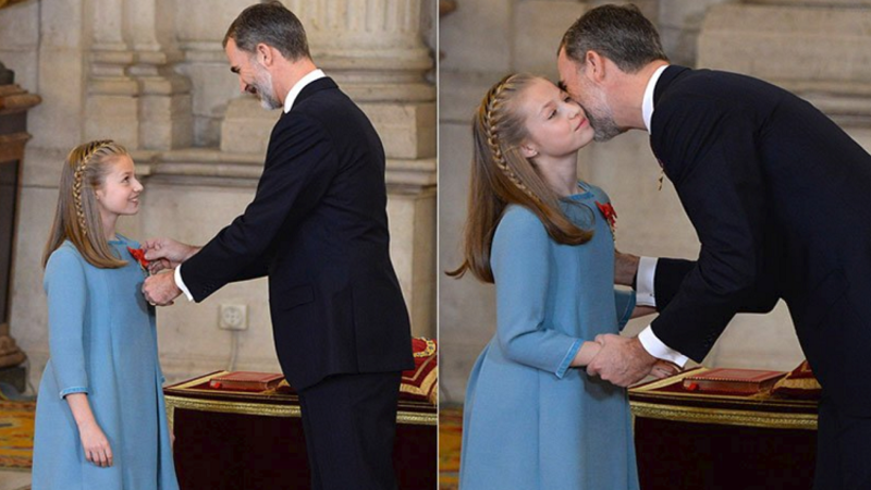 عين ملك إسبانيا فيليب السادس، أمس الثلاثاء، ابنته ليونور، البالغة من العمر 12 عاما، وريثة العهد، مقلدا إياها وشاحا ذهبيا رفيعا.