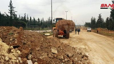 وذكرت وكالة "سانا" أنه فور استكمال الجيش السوري تأمين الطريق وتحرير المناطق المحيطة به من مدينة حلب مرورا بسراقب ومعرة النعمان بريف إدلب، باشرت الورشات الفنية والآليات عمليات إزالة السواتر الترابية والعوائق وردم الحفر لإعادة تأهيل الأتوستراد الدولي حلب دمشق عند مدخل حلب الغربي.