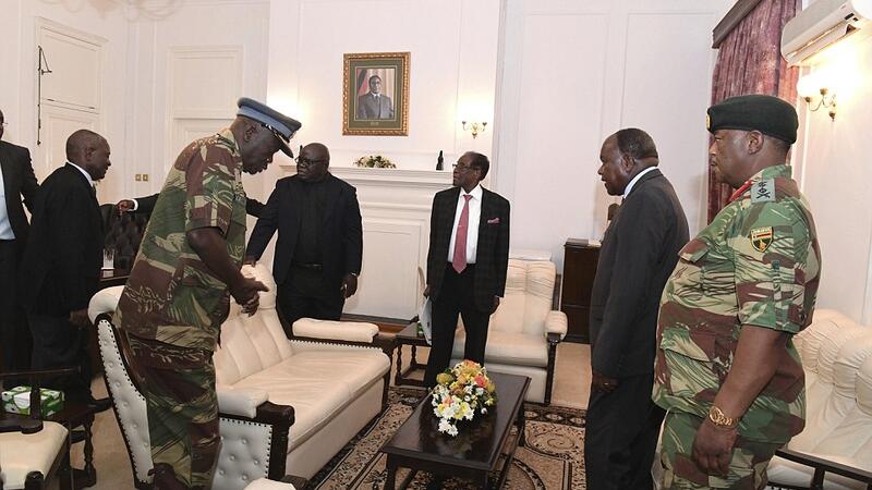 وفي الصور التي نشرتها الصحيفة على موقعها الالكتروني ظهر موجابي بحلة سوداء ورابطة عنق يقف وراء مكتب خشبي ويصافح الجنرالات وقائد الشرطة. وبجواره جهاز تلفزيون مفتوح على قناة الجزيرة.