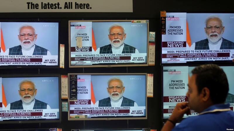 مودي خلال خطابه المتلفز الذي اعلن فيه عن اسقاط القمر الاصطناعي