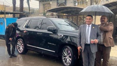 والى جانب سيارة فارهه وقف في مقدمتها النائب العراقي ، وقف احد الجنود المسلحين منحنيا، ويبدو انه يحاول تدارك الامطار التي ظهرت بوضوح في الصورة عن وجهه ، قابضا على باب السيارة الى ان تنتهي جلسة التصوير والمتعة للنائب ليفتح له الباب