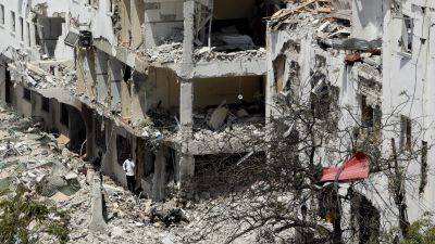 وشن مقاتلون من حركة الشباب الإسلامية هجوما بسيارة ملغومة خارج فندق مكة المكرمة مساء الخميس مما أسفر عن تدمير أبنية مجاورة ونشوب حريق ضخم، بينما بقي جرحى بين الحطام.