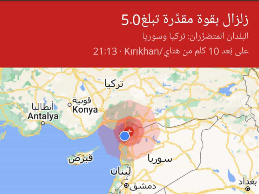قالت مصادر سورية ان هزة ارضية ضربت مساء الاحد شمال غرب مدينة إدلب في سوريا بقوة حيث شعر بها السكان وتسببت باحداث اضرار مادية وتشققات في منازل عدة مناطق وافادت المصادر ان اهالي محافظات حلب، واللاذقية، وحمص، وحماة، ودير الزور شهرو بالهزة