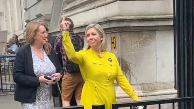 ورفعت الوزيرة إصبعها أمام حشد المتظاهرين بينما كانت تعبر من بوابات مقر الحكومة في داونينغ ستريت في لبندن الخميس,