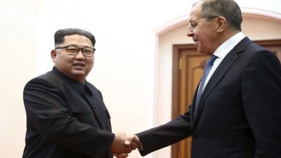 وكتبت الوزارة على تويتر أن “كيم جونغ اون استقبل سيرغي لافروف في بيونغ يانغ”، مرفقة التغريدة بصور للرجلين وهما يتصافحان