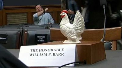 تمثال دجاجة وضع على مقعد خال لوزير العدل بيل بار في غرفة اللجنة القضائية في مجلس النواب