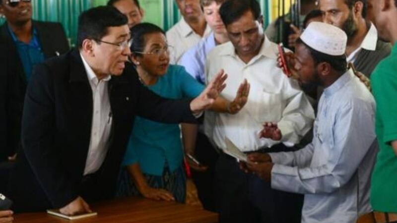 الوزير البورمي وين ميات آي يتحدث الى لاجئين من الروهينغا في مخيم كوتوبالونغ في منطقة أوخيا