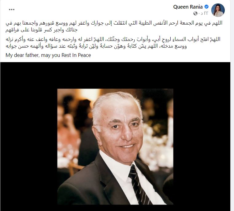 الديوان الملكي الهاشمي ينعى، بمزيد من الحزن والأسى، والد صاحبة الجلالة الملكة رانيا العبدالله، حفظها الله، المرحوم، بإذن الله، الطبيب فيصل صدقي الياسين #الأردن