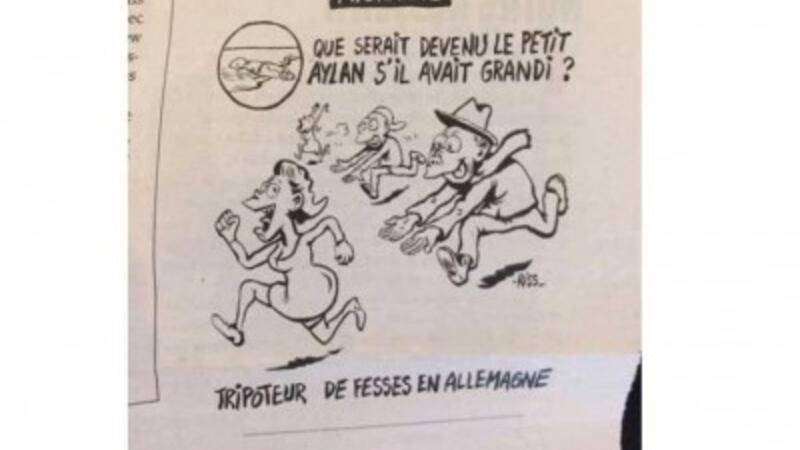 وتضمن القسم العلوي من الرسم الكاريكاتوري، رسمًا للطفل إيلان، كما ظهر في الصورة التي انتشرت في أنحاء العالم، بعد أن قذفت الأمواج بجثته على الشواطئ التركية، وفي القسم السفلي، ظهر رسم يصور مجموعة من اللاجئين يتحرشون بالنساء، وحمل الرسم عبارة “لو كبر إيلان، ماذا كان سيصبح؟” وقوبل الرسم بانتقادات واسعة على مواقع التواصل الاجتماعي، حيث اتهم مستخدمو المواقع، المجلة بـ “التعميم وتصوير جميع اللاجئين كمتحرشين”.