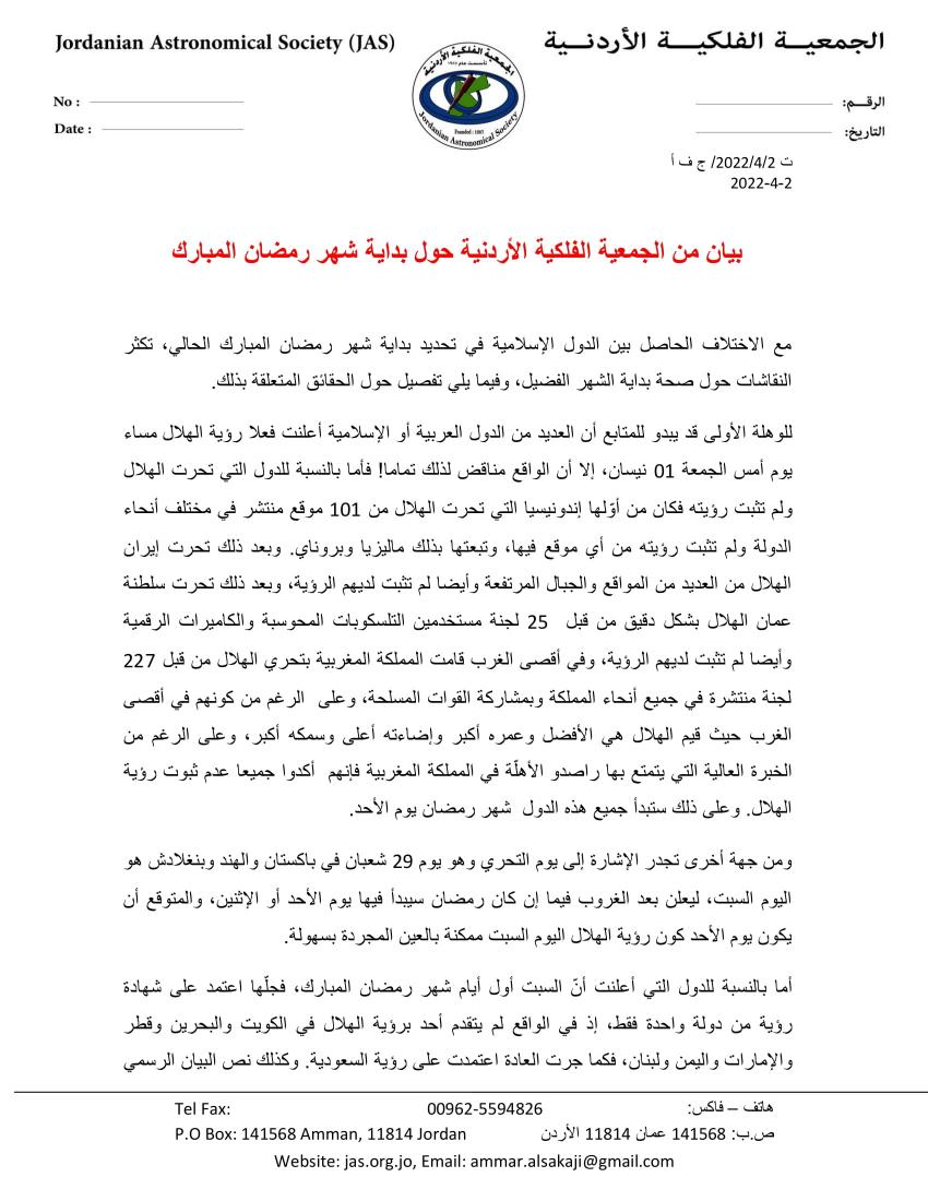 وياتي بيان الجمعية في خضم جدل محتدم عقب اعلان الاردن وخمس دول اخرى ان غرة رمضان ستكون يوم الاحد، بخلاف نحو خمسين دولة اسلامية اعلنت ان السبت هو بداية الشهير الكريم.