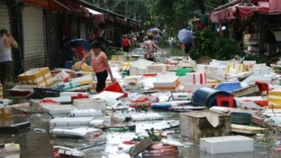 اعمال التنظيف في احد شوارع تشيامن بعد مرور الاعصار ميرانتي