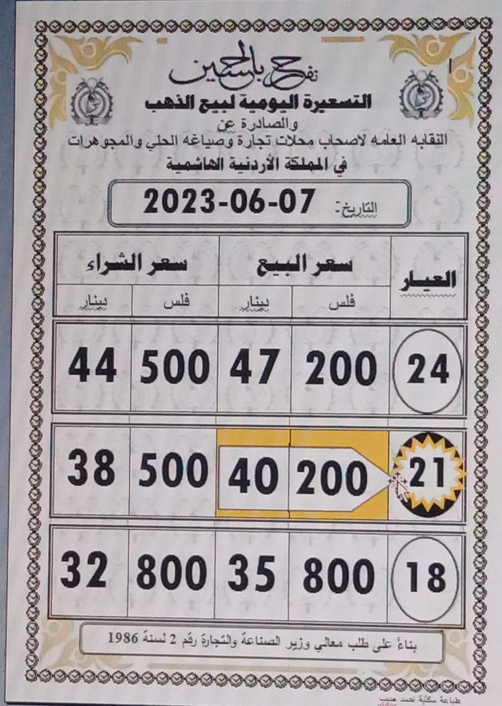 شهدت أسعار الذهب اليوم في الاردن، الأربعاء 7 يونيو استقراراً في مستهل تعاملات اليوم، بحسب التسعيرة الصادرة عن النقابة العامة لأصحاب محلات تجارة وصياغة الحلي والمجوهرات.