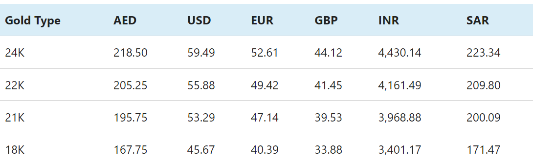 سجل سعر الجرام عيار 24 نحو 218.50 درهم إماراتي