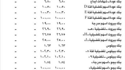 كما تراجعت اسهم بنك عودة المدرجة من 6.75 دولارات الى 6.65 دولارات. بالمقابل، ارتفعت اسهم بنك لبنان والمهجر المدرجة من 7.94 دولارات الى 8.04 دولارات واسهم بنك لبنان والمهجر «شهادة إيداع» من 8.41 دولارات الى 8.42 دولارات.