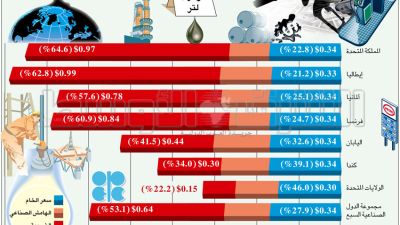 ومن المهم هنا الإشارة إلى أن تغيير السعر حدث بسبب التفاوت الكبير في مستوى الضرائب في كل دولة (باللون الأحمر) التي تفرضها أكثر الدول استهلاكاً للنفط. وتتفاوت النسب الضريبية ما بين نسب متواضعة، مثل الحال في الولايات المتحدة، ونسب بالغة الارتفاع، مثل الحال في أوروبا وآسيا ومنطقة المحيط الهادي.