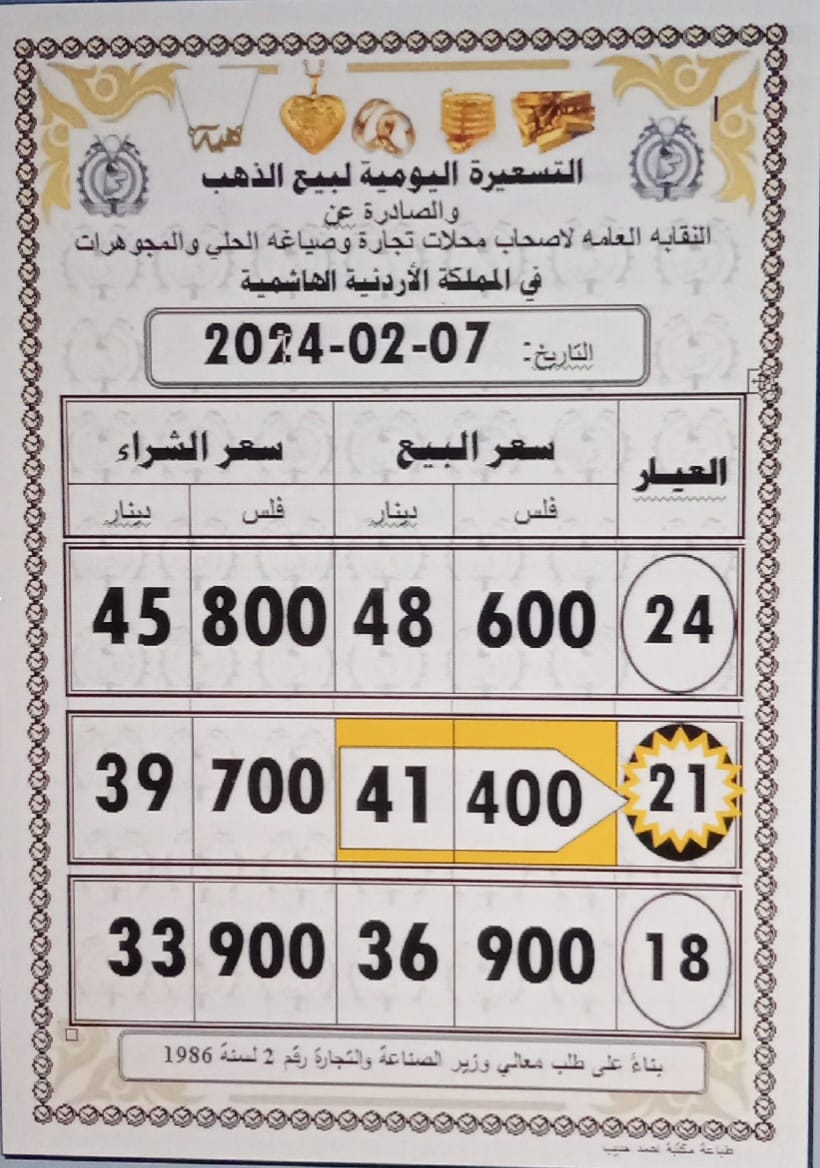 شهد سعر الذهب اليوم في الأردن، الأربعاء 7 فبراير استقرار نسبي في مستهل التعاملات الصباحية، بحسب التسعيرة الصادرة عن النقابة العامة لأصحاب محلات تجارة وصياغة الحلي والمجوهرات.