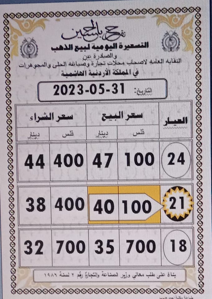سجل سعر الذهب اليوم في الاردن، الأربعاء 31 مايو ارتفاع طفيف في مستهل تعاملات اليوم، بحسب التسعيرة الصادرة عن النقابة العامة لأصحاب محلات تجارة وصياغة الحلي والمجوهرات.