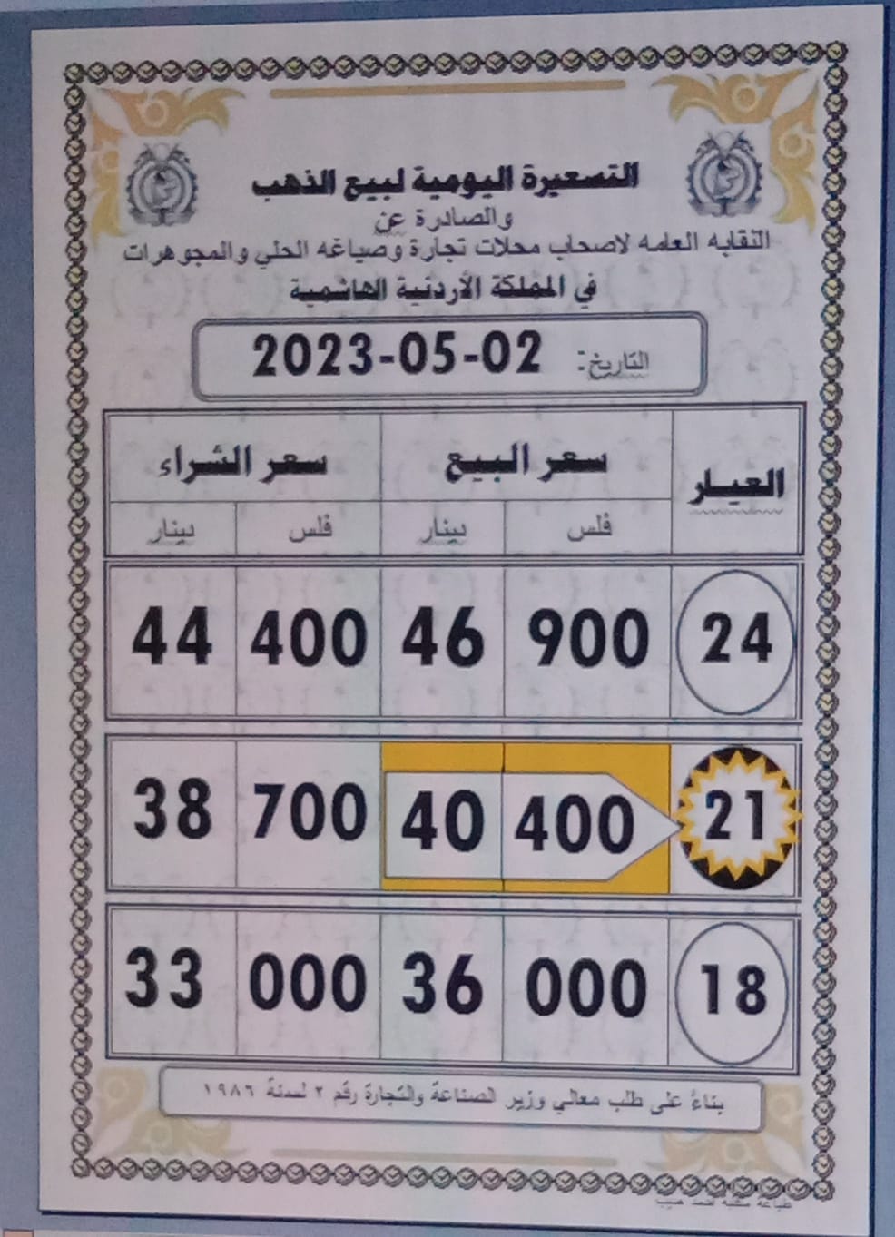 شهد سعر الذهب اليوم في الاردن، الثلاثاء 2 مايو ارتفاع طفيف في مستهل تعاملات اليوم، بحسب التسعيرة الصادرة عن النقابة العامة لأصحاب محلات تجارة وصياغة الحلي والمجوهرات.