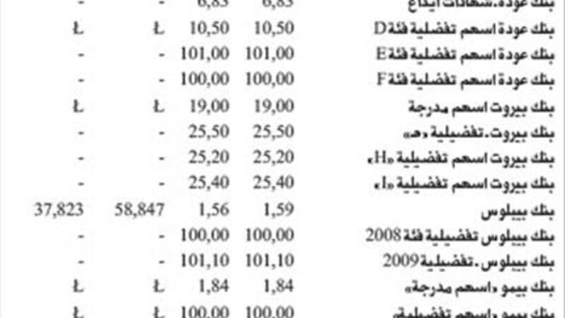 شهدت بورصة بيروت انخفاضاً في عدد الاسهم المتداولة من 211.429 الى110,841 سهما، و بلغت قيمتها 703.486 دولارا. انخفض مؤشر بنك لبنان والمهجر للأسهم الى 1,200.21 نقطة، تراجعت أسهم سوليدير «أ» من 12.92 الى 12.80 دولارا. وأسهم هولسيم من 16.50 الى 14.85 دولارا. وأسهم بنك بيبلوس المدرجة من 1.59 الى 1.56 دولار وأسهم بنك لبنان و المهجر «شهادة أيداع» من 8.90 الى 8.85 دولارات. وأسهم بنك لبنان و المهجر المدرجة من 8.40 الى 8.32 دولارات.