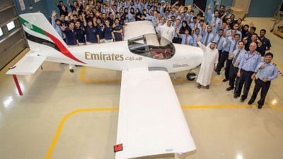 وقالت شركة «طيران الإمارات» إنه «على مدى عامين كاملين، نجح 40 مواطنا متدربا في الدائرة الهندسية لطيران الإمارات في تجميع 11 ألف قطعة شكلت في نهاية المطاف أول طائرة تبنيها طيران الإمارات، والطائرة الجديدة من طراز (آر في 12) ذات مقعدين ويصل طولها إلى 6 أمتار».