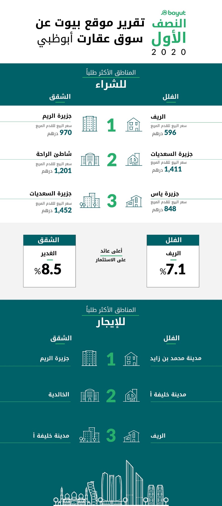 وأكد تقرير بيوت عن سوق عقارات أبوظبي للنصف الأول من 2020 أن أسعار العقارات في المناطق الأكثر طلباً في العاصمة لا تزال جاذبة للمستثمرين و المستأجرين على حد سواء، حيث شهدت أسعار العقارات انخفاضات طفيفة في معظم المناطق، مشيراً إلى أن المناطق الراقية مثل جزيرة الريم، شاطئ الراحة، جزيرة السعديات، وجزيرة ياس كانت الأكثر جذباً للمستثمرين الراغبين بشراء العقارات، فيما كانت مناطق الخالدية، مدينة خليفة أ، ومدينة محمد بن زايد الأعلى طلباً من قبل المستأجرين.