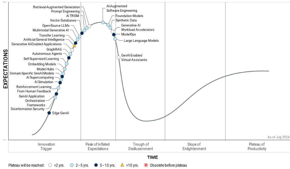 من جهته قال أرون شاندراسكاران، نائب الرئيس لشؤون التحليلات لدى جارتنر: "سيبقى التعامل مع الذكاء الاصطناعي التوليدي صعباً بالنسبة للمؤسسات نظراً للمنظومة الفوضوية والسريعة للتقنيات والمزودين. لقد وصل توظيف الذكاء الاصطناعي التوليدي إلى مرحلة تضاؤل الآمال بالتزامن مع بداية دمجه في القطاعات، إذ أن الفوائد الفعلية ستبدأ بالظهور بعد هدوء الضجة المثارة حوله، ومن المرجح أن تتوالى التطورات في القدرات بوتيرة متسارعة على مدى الأعوام القليلة المقبلة".