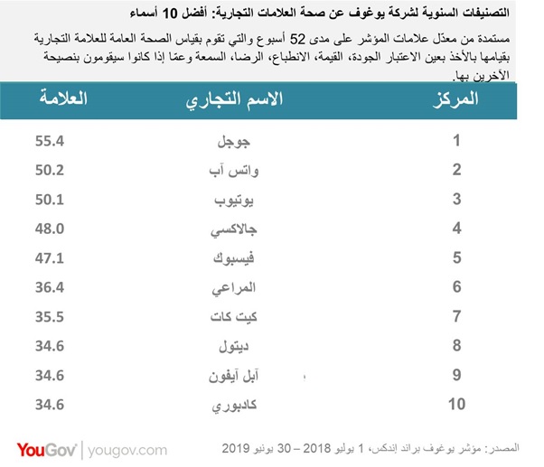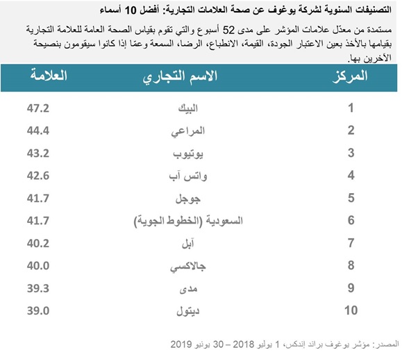 كشفت أحدث نتائج دراسة مؤشر يوغوف براند إندكس عن أن طيران الإمارات، سلسلة مطاعم البيك وجوجل هي أكثر الأسماء التجارية شعبية في منطقة الشرق الأوسط. وفي حين أن طيران الإمارات لايزال محافظاً على موقعه في المركز الأول في تقييمات المؤشر لدولة الإمارات للعام الثالث على التوالي، فقد استطاعت البيك وجوجل التغلّب على المراعي وفيسبوك في تقييمات مؤشرات السعودية ومصر، على التوالي.