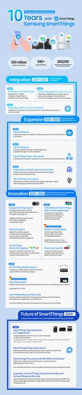 وانطلق SmartThings كمنصة إنترنت الأشياء (IoT) من سامسونج، تساهم في ربط منتجات سامسونج ومجموعة واسعة من الأجهزة من الشركات الشريكة. وقد تطور ليقدم تجربة متصلة سلسة ومصممة لتلبية احتياجات أنماط الحياة المتنوعة.