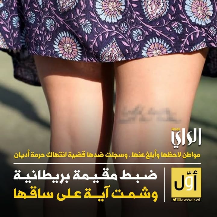 أعلنت قوات الأمن الكويتية عن ضبط مقيمة تحمل الجنسية البريطانية وَشَمَت "آية قرآنية" على ساقها.