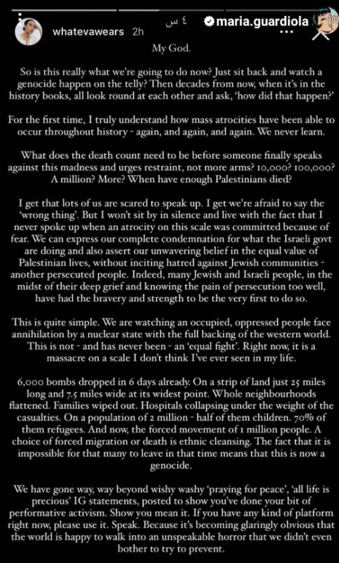 نشرت ماريّا بيب غوارديولا بيانًا تاريخيًا عبر حسابها الخاص على موقع التواصل الاجتماعي "انستغرام" تدعم فيه فلسطين وتطالب المجتمع الدولي بالتحرّك الفوري لمنع الابادات الجماعية التي تحدث في فلسطين وخاصة قطاع غزة خلال الأيام الماضية.