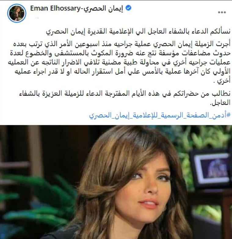 واضطرت الحصري للسفر إلى ألمانيا من أجل إجراء عملية جراحية جديدة بعد 5 أشهر من المعاناة الصحية بسبب الخطأ الطبي، ما تسبب في خضوعها لسلسلة من العمليات الجراحية الفاشلة التي أسفرت عن تدهور شديد بحالتها الصحية.