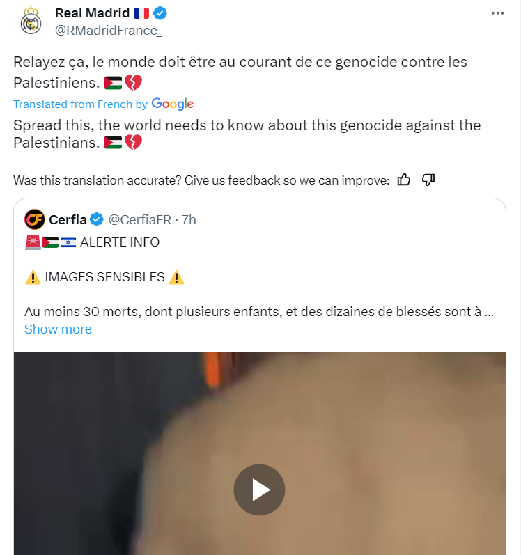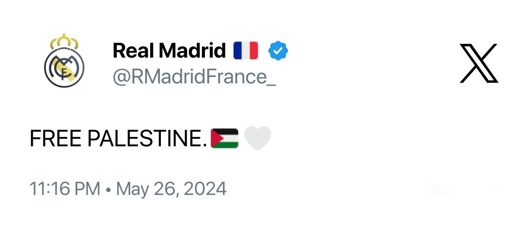 أثار حساب ريال مدريد - فرنسا على منصة "إكس"، تويتر سابقًا، موجة من التفاعل بعد نشره تغريدة تحمل رسالة "Free Palestine"، أي "فلسطين حرة"، معبرًا عن دعمه للقضية الفلسطينية وللشعب الفلسطيني في قطاع غزة والذي يتعرض منذ السابع من أكتوبر لإبادة جماعية على يد جيش الاحتلال الإسرائيلي.